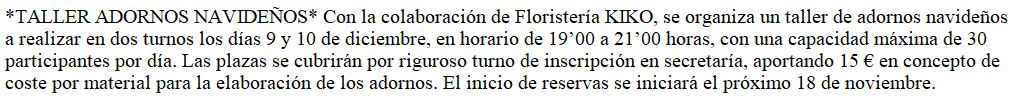 | 09/12/2025 | 19:00 | TALLER ADORNOS NAVIDEÑOS |  |